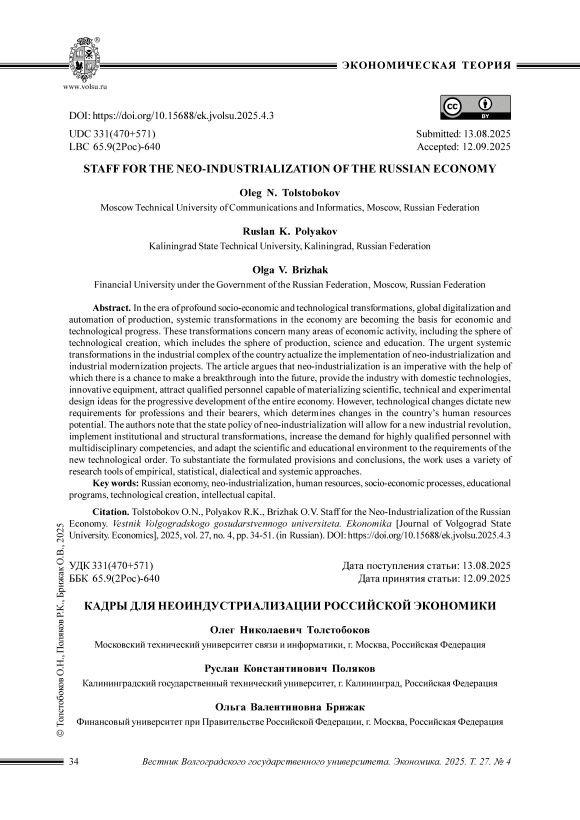 Российская экономика, неоиндустриализация, кадровый потенциал, социально-экономические процессы, образовательные программы, технологическое созидание, интеллектуальный капитал