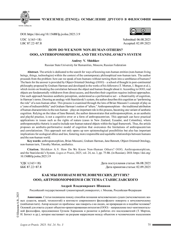 Статья посвящена поиску способов познания нечеловеческих сущих (нечеловеческих живых существ, вещей, технологий) в контексте современного философского поворота к нечеловеческому (nonhuman turn). Автор исходит из проблемы: как говорить о не-людях, не превращая их в подобие человека? Основой для ответа служит объектно-ориентированная онтология (ООО) – направление пост-континентальной философии, предложенное Грэмом Харманом и развитое в работах его последователей (Т. Мортон, И. Богост и др.), которое настаивает на разрыве корреляции между объектом и человеческим мышлением о нем. Согласно ООО реальные объекты принципиально изъяты из прямого доступа, и потому их познание требует непрямых подходов. Одним из таких подходов становится эстетическое восприятие, понимаемое как перформативный акт – театральность познания, по Харману. Проводя аналогию с системой Станиславского, автор описывает такое познание как «исполнение роли» нечеловеческого другого. Этот процесс рассматривается через призму концепции игры как «зоны неразличимости» Брайана Массуми и понятия «аллюра» Грэма Хармана. Важную роль в этом процессе играет антропоморфизм – традиционное уподобление нечеловеческого человеческому. Одним из вариантов эстетического познания становится антропоморфизм. Автор, опираясь на идеи Джейн Беннетт, показывает, что антропоморфизм, будучи эстетической и игровой практикой, не является ошибкой мышления или формой антропоцентризма. Этот подход может иметь практическое применение в таких вопросах как права природы (кейсы Новой Зеландии, Эквадора, Колумбии), где антропоморфная риторика используется для включения нечеловеческих природных объектов в правовое поле.Таким образом, статья предлагает эстетико-перформативную модель познания, которая преодолевает ограничения антропоцентризма и корреляционизма. Такой подход не только открывает новые эпистемологические возможности, но и имеет важные последствия для экологической этики и права, способствуя формированию более ответственных и равноправных отношений между человеком и нечеловеческим миром.