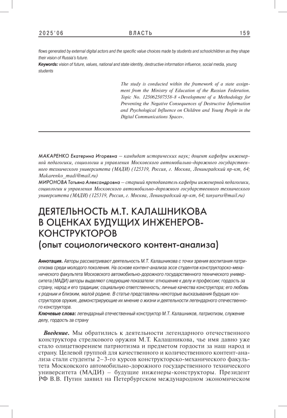The authors consider activities of M.T. Kalashnikov from the point of view of patriotism. Based on the content analysis of essays by students of the Faculty of Moscow Automobile and Road Construction State Technical University (MADI) the authors identify the following indicators: attitude to work and profession; pride in the country, people and their traditions; social responsibility; personal qualities of the designer; love for the family and relatives, for small homeland. The article also provides some statements by future weapons designers, demonstrating their opinion about the life and work of the legendary Russian designer.