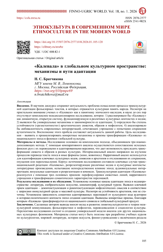Introduction. In academic discourse, the problem of conceptualizing the process of transcultural adaptation of folklore texts that embody the cultural memory of a people remains relevant. Despite the close attention scholars have paid to the “Kalevala” as a monument of epic heritage, there is still no comprehensive interdisciplinary study that would consider the “Kalevala” as a dynamic and open system functioning in diverse cultural contexts and media, identify the universal mechanisms and patterns of its adaptation, determine the degree of stability (“resilience”) of its archetypal plots, images, and mythologemes, and analyze the ambivalence of contemporary interpretations that combine simplification with attempts to preserve authenticity. Addressing this gap constitutes the relevance of the present study. The aim of the research is to identify and analyze the specific mechanisms and techniques through which the “Kalevala” has been transformed from a national epic into a phenomenon of global culture. Materials and Methods. The study is based on an integrated approach that combines three complementary methods. Comparative analysis is used to juxtapose the original Finnish runes with their translated and adapted versions, making it possible to trace the transformation of plots and images across different cultures. Intermedial analysis is aimed at examining the processes through which the epic text is translated into other formats, such as cinema and painting. Narrative analysis is employed to identify key cultural codes, symbols, and archetypes, and to trace their preservation, omission, or reinterpretation. The corpus of sources for the study consists of key cases of the transnational reception of the “Kalevala”, representing various media and cultural contexts: literary works that have experienced a direct influence of the epic; audiovisual interpretations; and visual adaptations and representations in comics. The transcultural adaptation of the “Kalevala” is realized through three principal techniques: the refocusing of plot lines, narrative simplification, and the transformation of the semantic characteristics of characters. Results and Discussion. The principal channels through which the epic is adapted within the media space have been identified: literature, visual art, cinema, and cultural tourism. The key technique of adaptation has been determined to be the decontextualization and subsequent recontextualization of mythological meanings in accordance with the demands of a foreign cultural environment and mass culture. Despite the persistence of archetypes, they are not static. The semantics of adapted characters have been shown to depend on the cultural code of the audience as well as on the historical and political context of the period in which the adaptation was created. Specific techniques have been identified through which the “Kalevala” is transformed from a national symbol into a global cultural product. Conclusion. The conclusions drawn by the author contribute to the development of linguocultural studies and the theory of intercultural communication, as well as to folklore studies and mythology, translation studies, and the sociology of culture. The prospects of the research lie in the creation of a universal analytical model applicable to other national cultural phenomena. The materials of the article may prove useful in the development of academic courses in cultural studies, world literature, the history of art, and Finno-Ugric studies, including sections devoted to contemporary interpretations of epic heritage; in the preparation of textbooks and anthologies illustrating the transformation of folkloric narratives in mass culture (using the Kalevala as an example); and in the preparation of lecture materials for continuing education programs dedicated to the visualization of epic narratives in cinema, comics, and painting.