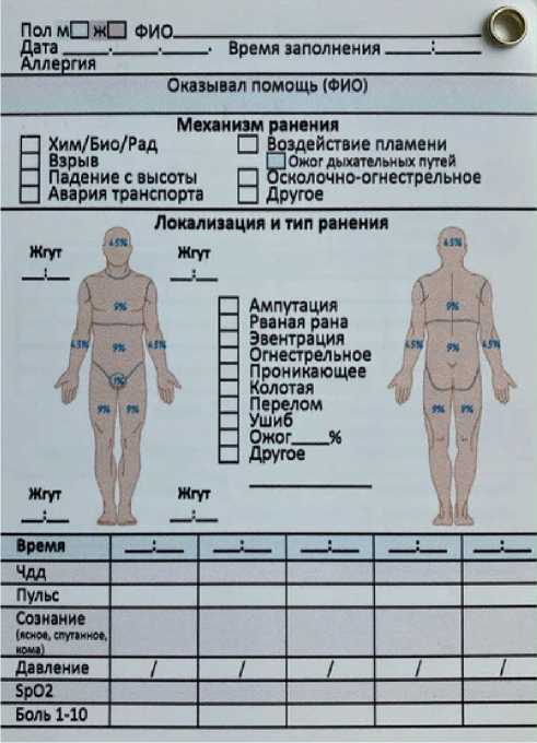 Рисунок 1 – Пример (вариант) карточки раненого, востребованной на всех этапах оказания первой помощи