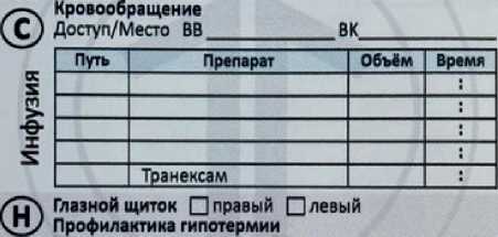 – доступ/место – тип и место постановки внутрисосудистого доступа (ВВ – внутривенный доступ, ВК – внутрикостный).