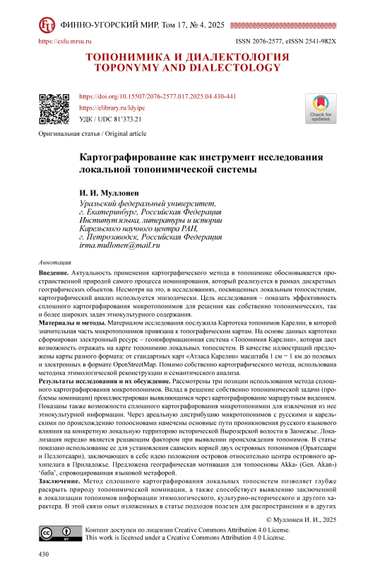 Введение. Актуальность применения картографического метода в топонимике обосновывается пространственной природой самого процесса номинирования, который реализуется в рамках дискретных географических объектов. Несмотря на это, в исследованиях, посвященных локальным топосистемам, картографический анализ используется эпизодически. Цель исследования – показать эффективность сплошного картографирования микротопонимов для решения как собственно топонимических, так и более широких задач этнокультурного содержания. Материалы и методы. Материалом исследования послужила Картотека топонимов Карелии, в которой значительная часть микротопонимов привязана к топографическим картам. На основе данных картотеки сформирован электронный ресурс – геоинформационная система «Топонимия Карелии», которая дает возможность отражать на карте топонимию локальных топосистем. В качестве иллюстраций предложены карты разного формата: от стандартных карт «Атласа Карелии» масштаба 1 см = 1 км до полевых и электронных в формате OpenStreetMap. Помимо собственно картографического метода, использована методика этимологической реконструкции и семантического анализа. Результаты исследования и их обсуждение. Рассмотрены три позиции использования метода сплошного картографирования микротопонимов. Вклад в решение собственно топонимической задачи (проблемы номинации) проиллюстрирован выявляющимся через картографирование маршрутным видением. Показаны также возможности сплошного картографирования микротопонимии для извлечения из нее этнокультурной информации. Через ареальную дистрибуцию микротопонимов с русскими и карельскими по происхождению топоосновами намечены основные пути проникновения русского языкового влияния на конкретную локальную территорию исторической Вырозерской волости в Заонежье. Локализация нередко является решающим фактором при выявлении происхождения топонимов. В статье показано использование ее для установления саамских корней двух островных топонимов (Орьятсаари и Пеллотсаари), заключающих в себе идею положения островов относительно центра островного архипелага в Приладожье. Предложена географическая мотивация для топоосновы Akka— (Gen. Akan-) ‘баба’, спровоцированная языковой метафорой. Заключение. Метод сплошного картографирования локальных топосистем позволяет глубже раскрыть природу топонимической номинации, а также способствует выявлению заключенной в локализации топонимов информации этимологического, культурно-исторического и другого характера. В этой связи опыт изложенных в статье подходов полезен для распространения и в других топонимических экспедициях. Результаты исследования вносят вклад в развитие картографического метода, а также в изучение топонимической номинации, которая происходит в рамках локальной топонимической системы.