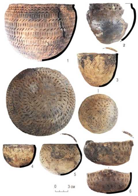 Вариант 2 (3 изд.) – закрытые, круглодонные, края обрезов венчиков дополнительно обработанные; орнамент нанесен неаккуратно, рядность неплотная, сбитая. Для нанесения орнамента использовались крупный гребенчатый и гладкий штампы, а также накол концом гладкой палочки. Мотивы однорядные и многорядные, горизонтальные, зигзагообразные, вертикальные и наклонные (рис. 1, 4 , 5 ) 3.