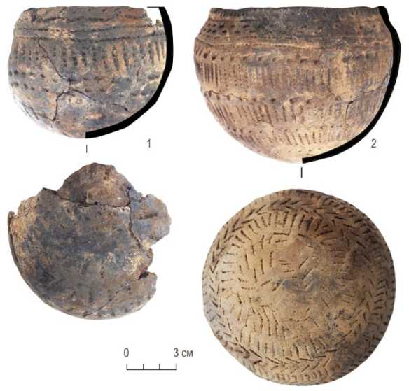 Чаша (1 экз.) закрытой формы с невыраженным плечом / предплечьем, необработанным и неорнаментированным срезом венчика. Орнамент чаши не плотный, нанесен при помощи сочетания штампования и накола крупным гребенчатым орнаментиром. Сосуд орнаментирован полностью, за исключением обреза венчика. Композиция распадается на две зоны: венчик – тулово и тулово – дно (рис. 2, 1 ).