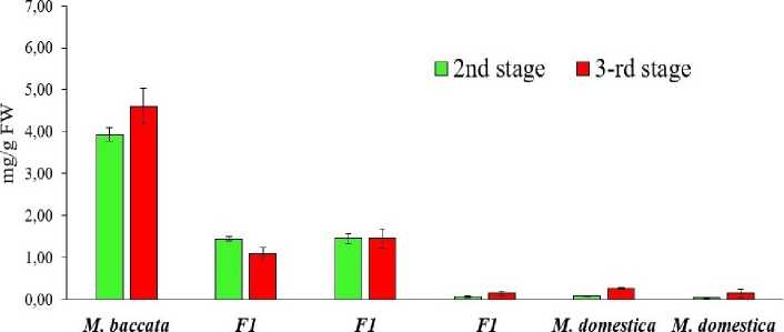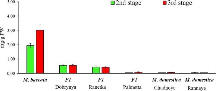 Figure 1. Dynamics of AA accumulation in the peel of M. baccata , M. × domestica and F1 hybrids at the stage of active growth and fruit maturity in 2020–2022.