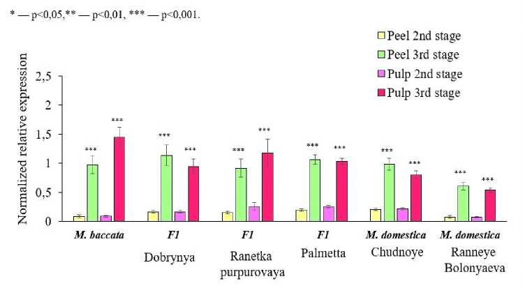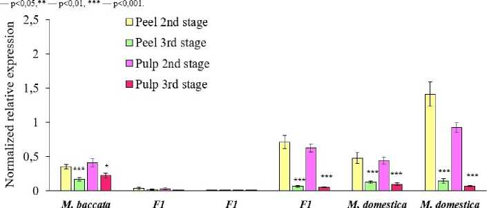 Figure 3. Dynamics of relative GGP3 expression in the tissues of M. baccata , M. × domestica and F1 hybrid fruits at the 2nd and 3rd stages of fruit development in 2020–2022.