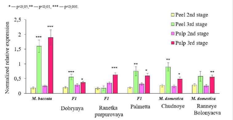 Figure 5. Dynamics of relative expression of MDHAR1 in tissues of M. baccata , M. × domestica and their F1 hybrids at the 2nd and 3rd stages of fruit development in 2020–2022.