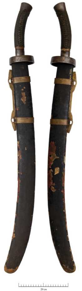 Рис. 1 (фото). Сабля нювэйдао в ножнах (с двух сторон; инвентарные номера ГОМ-7100-1, ГОМ-7100-2; НГИАМЗ)
