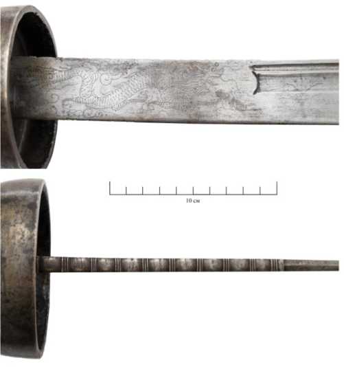 У основания клинка с двух сторон выгравирован распространенный в Китае во второй половине XIX в. сюжет: играющий с жемчужиной дракон [Карлова и др., 2015, с. 290] – символ богатства и мудрости. Обух клинка над гравировкой на протяжении 14 см декоративно оформлен в виде контура облаков (?) (рис. 3).