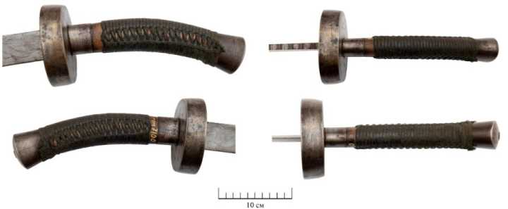 Между деревянной обкладкой и гардой расположена овальная в сечении обоймица, предохраняющая рукоять от раскалывания при ударе. Длина обоймицы – 2,8 см, ширина в большой полуоси – 3,8 см, в малой полуоси – 2,8 см.