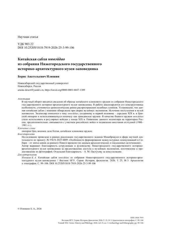 В научный оборот вводятся сведения об образце китайского клинкового оружия из собрания Нижегородского государственного историко-архитектурного музея-заповедника. В работе анализируются его конструктивные особенности, уточняются хронологические рамки распространения подобных клинков. Установлено, что данная китайская сабля с ножнами обнаружена при сверке музейных экспонатов. Источник поступления в музей неизвестен. Экземпляр относится к типу нювэйдао, созданному в первой половине – середине XIX в. в Цинской империи и использовавшемуся поначалу как гражданское оружие. В качестве боевого оружия нювэйдао стали использовать в регулярных войсках с конца XIX в. Появление данного экземпляра на территории России, предположительно, связывается с участием российских войск в подавлении восстания ихэтуаней (1900–1901 гг.).