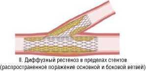 II. Диффузный рестеноз в пределах стентов (распространенное поражение основной и боковой ветвей) |