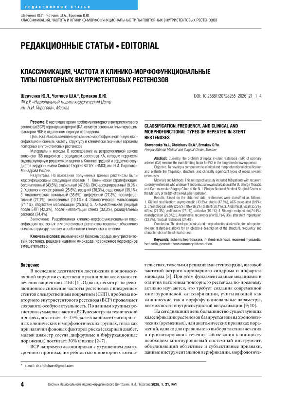 Currently, the problem of repeat in-stent restenosis (ISR) of coronary arteries (CA) remains the main limiting factor for PCI in the long-term follow-up period. Objective. To develop a comprehensive clinical and morphofunctional classification and evaluate the frequency, structure, and clinically significant types of repeat in-stent restenoses. Materials and methods. This retrospective study included 168 patients with recurrent coronary restenosis who underwent endovascular revascularization at the St. George Thoracic and Cardiovascular Surgery Clinic of the N. I. Pirogov National Medical Surgical Center of the Ministry of Health of the Russian Federation. Results. Based on the obtained data, restenoses were classified as follows: 1. Clinical stratification: asymptomatic (43.5%), stable (47.6%), ACS-associated (8.9%); 2. Chronological: early (25.6%), late (36.3%), distant (38.1%); 3. Anatomical: local (35.5%), diffuse (27.3%), proliferative (27.1%), occlusive (10.1%); 4. Etiologic: malposition (74.4%), no malposition (25.6%); 5. Anamnestic: recurrence after BLP (42.3%), after stent implantation (33.3%), residual restenosis (24.4%). Conclusion. The developed clinical and morphofunctional classification of repeated in-stent restenoses allows for an objective description of the structure, frequency and characteristics of the clinical course.