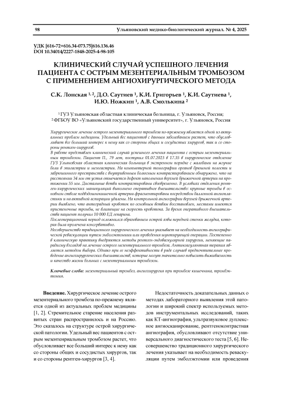 Клинический случай успешного лечения пациента с острым мезентериальным тромбозом с применением ангиохирургического метода