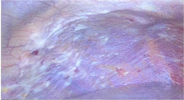 Рис. 3. Интраоперационно правый купол диафрагмы с перитонеальными метастазами до начала лечения. Множественные очаги от 5 до 15 мм