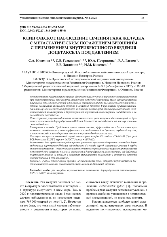 Текст научной статьи Клиническое наблюдение лечения рака желудка с метастатическим поражением брюшины с применением внутрибрюшного введения доцетаксела под давлением