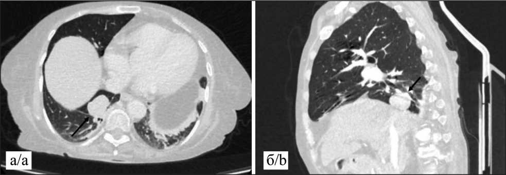 Рис. 1 Компьютерная томография в аксиальной (а) и сагиттальной (б) проекции в легочном и мягкотканом окне, толщина срезов 1,5 мм. В S10 правого легкого паравертебрально солидное периферическое образование с четкими контурами, размерами 32×26×20 мм, с высоким градиентом накопления контраста с 35 до 150 ед HU в артериальную фазу. Данных за внутригрудное лимфогенное или отдаленное метастазирование не выявлено. Примечание: рисунок выполнен авторами