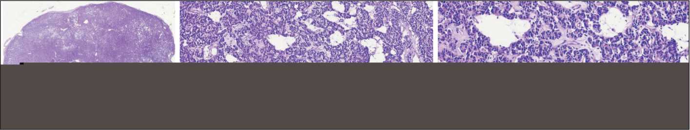 При патоморфологическом исследовании операционного материала получены следующие данные. Операционный материал был фиксирован сразу после операции в забуференном 10 % растворе нейтрального формалина в течение 24 ч при температуре +4–5 °С, после чего рутинным методом с использованием заливки в парафин были изготовлены серийные гистологические препараты, окрашенные гематоксилином и эозином. Патологоанатомические исследования проводили, строго соблюдая принципы биобезопасности. Иммуногистохимическое исследование проводили с использованием иммуностейнера Ventana BenchMark Ultra и антител к CD 56, Chromogranin A, Synaptophysin, TTF-1, Ki67, Pan Keratin.