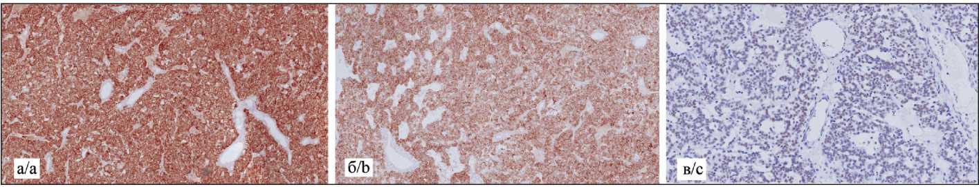 Fig. 3. Microphoto. IHC study. Cytoplasmic strong expression of Synaptophysin (a) and CD56 by tumor cells (b), The nuclear expression of TTF1 by tumor cells on the periphery of the lesion is weak to moderate (c); a–c – ×10. Note: created by the authors