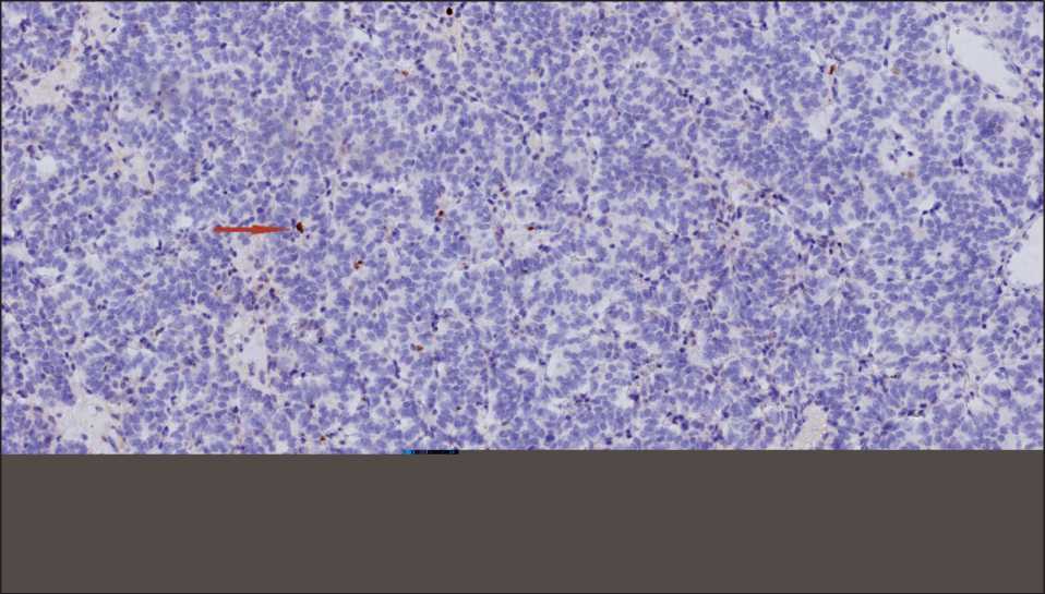 Рис. 4. ИГХ-исследование. Индекс Ki67 равномерный, невысокий – до 2 % (стрелками обозначены единичные позитивные клетки), ×10. Примечание: рисунок выполнен авторами