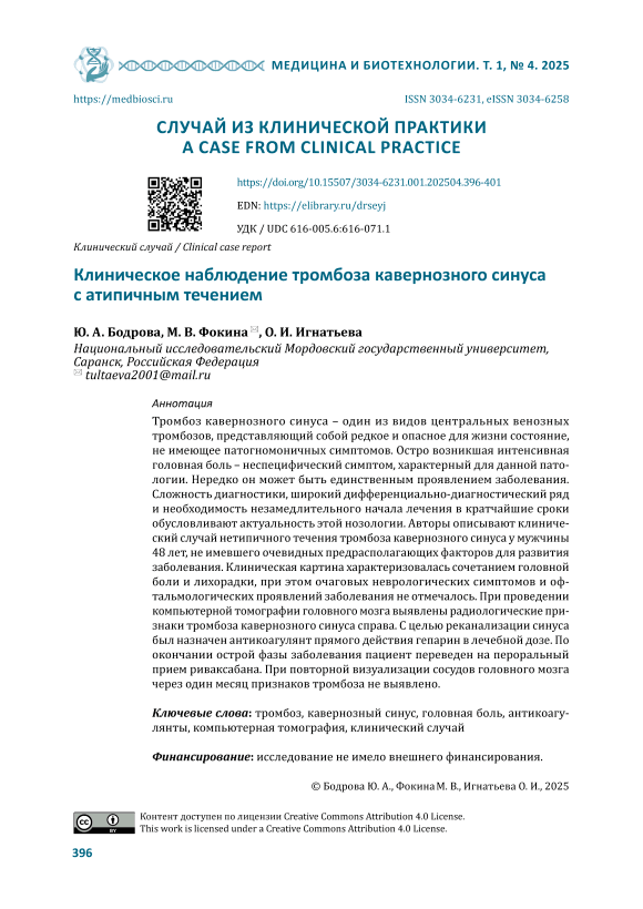 Церебральный венозный тромбоз (ЦВТ) – редкое жизнеугрожающее заболевание; распространенность в развитых странах составляет 1,3-1,6 случаев на 100 тыс. населения в год. ЦВТ служит причиной 0,5–1,0 % поступлений в инсультный центр. Женщины в возрасте 31–50 лет характеризуются более высокой заболеваемостью – 2,8 на 100 тыс. населения в год. Средний возраст пациентов соответствует 33 годам [1]. Асептический тромбоз кавернозного синуса (ТКС) может развиваться вследствие окклюзии кровяным сгустком пещеристого синуса, встречается наиболее редко из всех случаев ЦВТ [2]. Летальность при венозных тромбозах составляет от 2 до 38 %, поэтому чрезвычайно важно вовремя их диагностировать и начать лечение, которое включает в себя незамедлительное назначение нефракционирован-ного или низкомолекулярного гепарина [3]. Сложность своевременной диагностики заключается в том, что патогномоничные для ЦВТ симптомы отсутствуют. Компьютерная томография (КТ) с венографией является чувствительным методом для верификации ЦВТ и целесообразна при недоступности магнитно-резонансной томографии (МРТ) или наличии противопоказаний к ее проведению. Использование МРТ в Т1- и Т2 режиме позволяет визуализировать тромб в виде гипоинтенсивной зоны, но может давать отрицательный результат в острой фазе (первые 5 дней) [1].