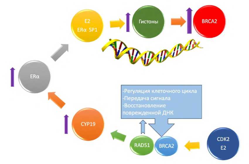 Интересно, но эта связь не является односторонней. Ген BRCA2 также способен косвенно регулировать уровень эстрогенов в тканях, воздействуя на экспрессию гена CYP19 . Этот ген кодирует ароматазу — фермент, который превращает андрогены в эстрогены [17, 18]. Таким образом, BRCA2 играет важную роль в поддержании гормонального баланса в клетке (Рис. 1).