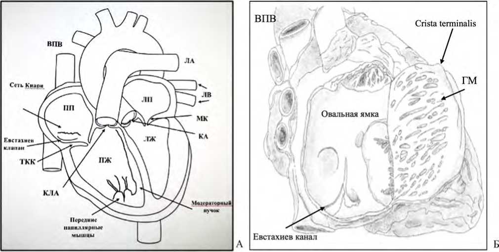 Рис. 1. А – схема строения сердца и положения евстахиева клапана, сети Киари в правом предсердии, модераторного пучка правого желудочка. ВПВ – верхняя полая вена, ПП – правое предсердие, ТКК – трикуспидальный клапан, КЛА – клапан легочной артерии, ПЖ – правый желудочек, ЛА – легочная артерия, ЛП – левое предсердие, ЛВ – легочные вены, МК – митральный клапан, КА – клапан аорты, ЛЖ – левый желудочек; Б – схема топографии евстахиева канала, гребенчатых мышц (ГМ) и crista terminalis в правом предсердии
