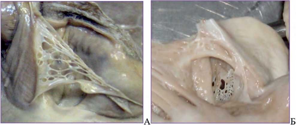 Рис. 2. А, Б. Макроскопическая картина вариантов строения сети Киари в правом предсердии [2]