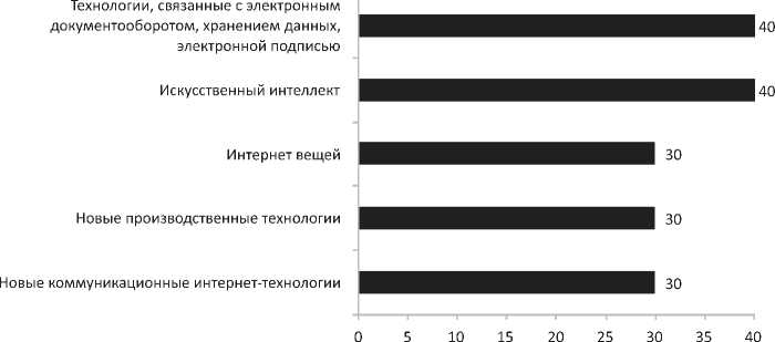 Более того, как отмечают эксперты, в ближайшие три года планируется освоение следующих направлений: искусственный интеллект (50 %); новые производственные технологии (40 %); технологии виртуальной и дополненной реальности (30 %); технологии распределенных реестров (40 %); робототехника и сенсорика (20 %); Интернет вещей (10 %); технологии, связанные с электронным документооборотом, хранением данных, электронной подписью (10 %).