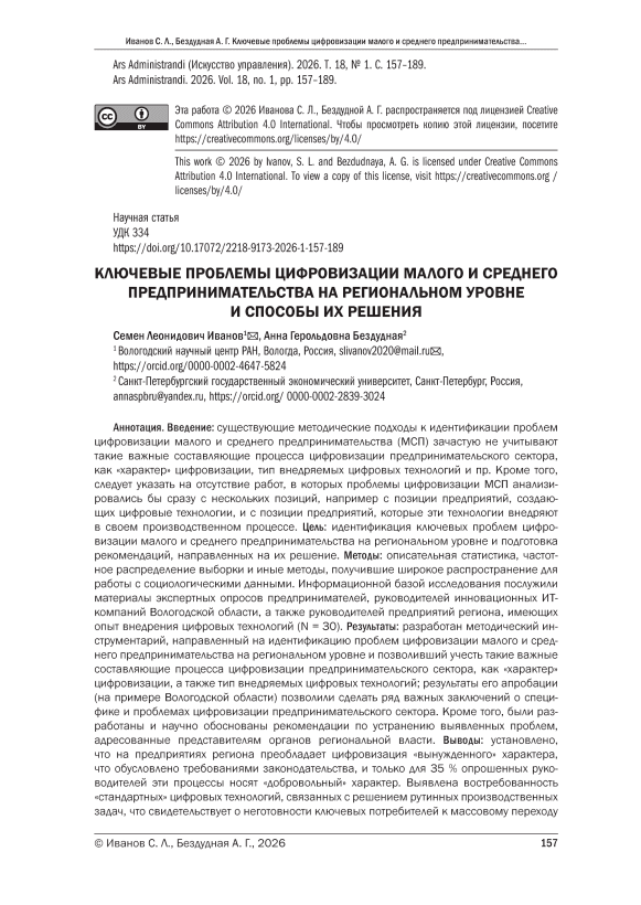 Введение: существующие методические подходы к идентификации проблем цифровизации малого и среднего предпринимательства (МСП) зачастую не учитывают такие важные составляющие процесса цифровизации предпринимательского сектора, как «характер» цифровизации, тип внедряемых цифровых технологий и пр. Кроме того, следует указать на отсутствие работ, в которых проблемы цифровизации МСП анализировались бы сразу с нескольких позиций, например с позиции предприятий, создающих цифровые технологии, и с позиции предприятий, которые эти технологии внедряют в своем производственном процессе. Цель: идентификация ключевых проблем цифровизации малого и среднего предпринимательства на региональном уровне и подготовка рекомендаций, направленных на их решение. Методы: описательная статистика, частотное распределение выборки и иные методы, получившие широкое распространение для работы с социологическими данными. Информационной базой исследования послужили материалы экспертных опросов предпринимателей, руководителей инновационных ИТ-компаний Вологодской области, а также руководителей предприятий региона, имеющих опыт внедрения цифровых технологий (N = 30). Результаты: разработан методический инструментарий, направленный на идентификацию проблем цифровизации малого и среднего предпринимательства на региональном уровне и позволивший учесть такие важные составляющие процесса цифровизации предпринимательского сектора, как «характер» цифровизации, а также тип внедряемых цифровых технологий; результаты его апробации (на примере Вологодской области) позволили сделать ряд важных заключений о специфике и проблемах цифровизации предпринимательского сектора. Кроме того, были разработаны и научно обоснованы рекомендации по устранению выявленных проблем, адресованные представителям органов региональной власти. Выводы: установлено, что на предприятиях региона преобладает цифровизация «вынужденного» характера, что обусловлено требованиями законодательства, и только для 35 % опрошенных руководителей эти процессы носят «добровольный» характер. Выявлена востребованность «стандартных» цифровых технологий, связанных с решением рутинных производственных задач, что свидетельствует о неготовности ключевых потребителей к массовому переходу на использование «передовых» технологий. Предприятиям региона, внедряющим цифровые технологии в свою деятельность, в первую очередь необходима финансовая поддержка; также региональные органы власти должны стимулировать компании на внедрение таких технологий, а инновационные ИТ-предприятия – на их производство.