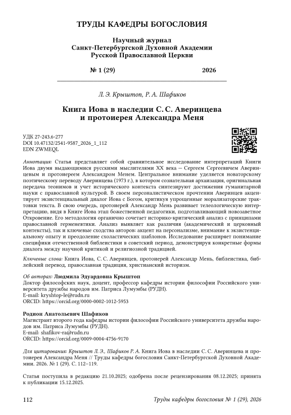 The article presents a comparative study of the interpretations of the Book of Job by two prominent Russian thinkers of the 20th century — Sergey S. Averintsev and Archpriest Alexander Men. Central focus is placed on Averintsev’s innovative poetic translation (1973), where deliberate archaization, original rendering of theonyms, and attention to historical context synthesize the achievements of humanities with Orthodox culture. In his personalistic reading, Averintsev emphasizes Job’s existential dialogue with God, critiquing simplified moralistic interpretations. In turn, Fr. Alexander Men develops a teleological interpretation, viewing the Book of Job as a stage in divine pedagogy preparing for the New Testament revelation. His methodology organically combines historical- critical analysis with the principles of Orthodox hermeneutics. The analysis reveals both differences (academic vs. ecclesiastical contexts) and key similarities: a focus on personalism, attention to existential experience, and the overcoming of scholastic templates. The research broadens the understanding of the specifics of Russian biblical studies during the Soviet period, demonstrating concrete forms of dialogue between scientific criticism and religious tradition.