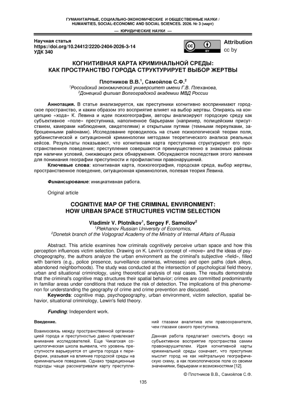 В статье анализируется, как преступники когнитивно воспринимают городское пространство, и каким образом это восприятие влияет на выбор жертвы. Опираясь на концепцию «хода» К. Левина и идеи психогеографии, авторы анализируют городскую среду как субъективное «поле» преступника, наполненное барьерами (например, полицейским присутствием, камерами наблюдения, свидетелями) и открытыми путями (темными переулками, заброшенными районами). Исследование проводилось на стыке психологической теории поля, урбанистической и ситуационной криминологии методами теоретического анализа реальных кейсов. Результаты показывают, что когнитивная карта преступника структурирует его пространственное поведение; преступления совершаются преимущественно в знакомых районах при наличии условий, снижающих риск обнаружения. Обсуждаются последствия этого явления для понимания географии преступности и профилактики правонарушений.