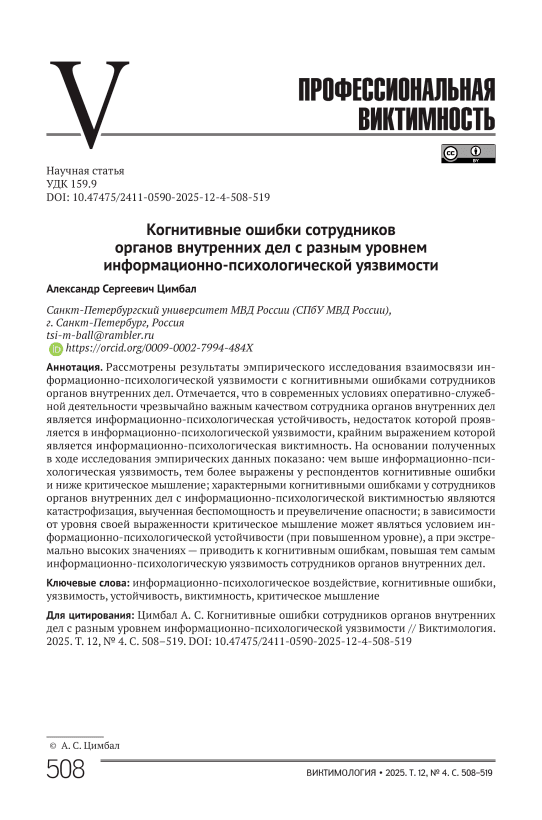 Отметим, что, несмотря на наличие исследований, когнитивные ошибки в контексте информационно-психологической уязвимости нуждаются в дополнительном эмпирическом анализе и обобщении. В частности, актуальными являются вопросы о том, связаны ли когнитивные ошибки с информационно-психологической уязвимостью, а также существуют ли различия в их выраженности у сотрудников органов внутренних дел с разным уровнем уязвимости (устойчивости и виктимности).
