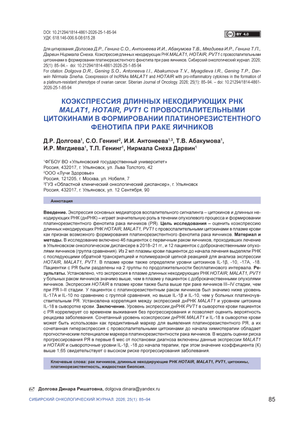 Коэкспрессия длинных некодирующих РНК MALAT1, HOTAIR, PVT1 с провоспалительными цитокинами в формировании платинорезистентного фенотипа при раке яичников