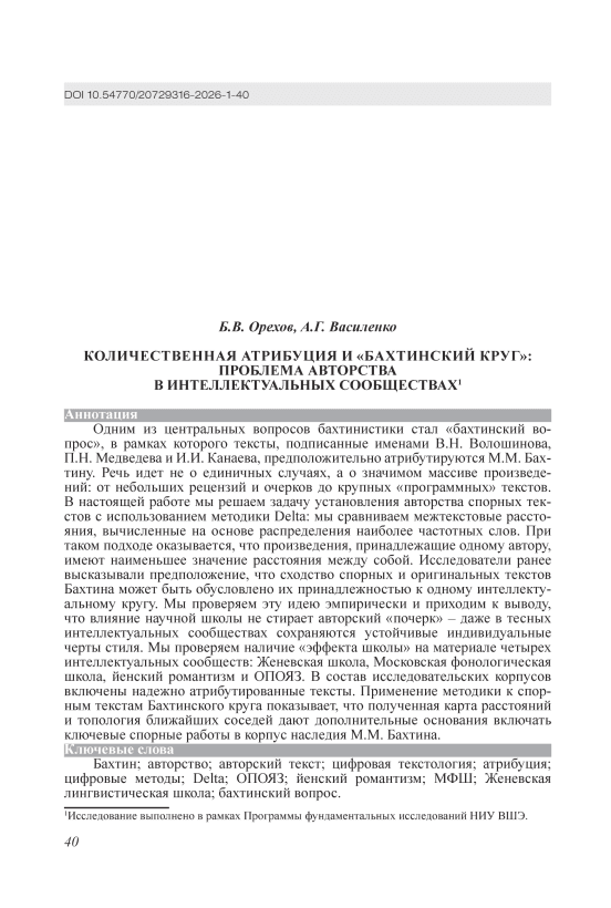Одним из центральных вопросов бахтинистики стал «бахтинский вопрос», в рамках которого тексты, подписанные именами В.Н. Волошинова, П.Н. Медведева и И.И. Канаева, предположительно атрибутируются М.М. Бахтину. Речь идет не о единичных случаях, а о значимом массиве произведений: от небольших рецензий и очерков до крупных «программных» текстов. В настоящей работе мы решаем задачу установления авторства спорных текстов с использованием методики Delta: мы сравниваем межтекстовые расстояния, вычисленные на основе распределения наиболее частотных слов. При таком подходе оказывается, что произведения, принадлежащие одному автору, имеют наименьшее значение расстояния между собой. Исследователи ранее высказывали предположение, что сходство спорных и оригинальных текстов Бахтина может быть обусловлено их принадлежностью к одному интеллектуальному кругу. Мы проверяем эту идею эмпирически и приходим к выводу, что влияние научной школы не стирает авторский «почерк» – даже в тесных интеллектуальных сообществах сохраняются устойчивые индивидуальные черты стиля. Мы проверяем наличие «эффекта школы» на материале четырех интеллектуальных сообществ: Женевская школа, Московская фонологическая школа, йенский романтизм и ОПОЯЗ. В состав исследовательских корпусов включены надежно атрибутированные тексты. Применение методики к спорным текстам Бахтинского круга показывает, что полученная карта расстояний и топология ближайших соседей дают дополнительные основания включать ключевые спорные работы в корпус наследия М.М. Бахтина.