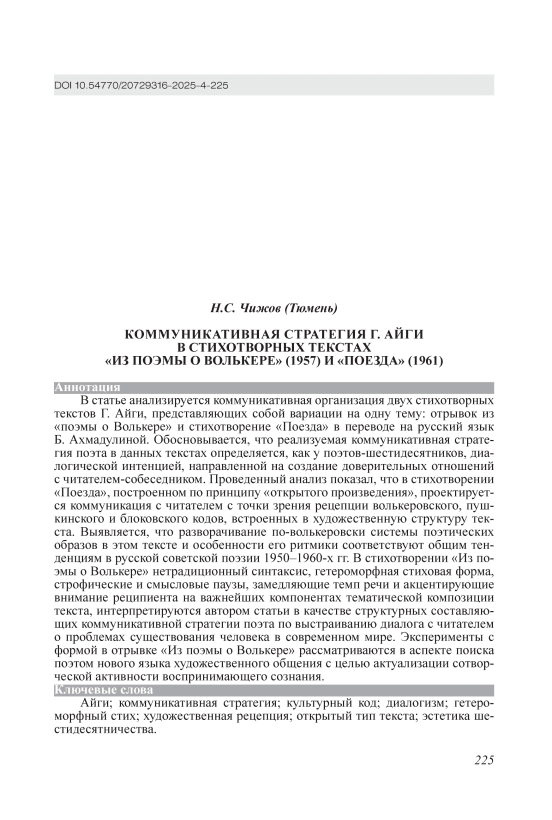 В статье анализируется коммуникативная организация двух стихотворных текстов Г. Айги, представляющих собой вариации на одну тему: отрывок из «поэмы о Волькере» и стихотворение «Поезда» в переводе на русский язык Б. Ахмадулиной. Обосновывается, что реализуемая коммуникативная стратегия поэта в данных текстах определяется, как у поэтов-шестидесятников, диалогической интенцией, направленной на создание доверительных отношений с читателем-собеседником. Проведенный анализ показал, что в стихотворении «Поезда», построенном по принципу «открытого произведения», проектируется коммуникация с читателем с точки зрения рецепции волькеровского, пушкинского и блоковского кодов, встроенных в художественную структуру текста. Выявляется, что разворачивание по-волькеровски системы поэтических образов в этом тексте и особенности его ритмики соответствуют общим тенденциям в русской советской поэзии 1950–1960-х гг. В стихотворении «Из поэмы о Волькере» нетрадиционный синтаксис, гетероморфная стиховая форма, строфические и смысловые паузы, замедляющие темп речи и акцентирующие внимание реципиента на важнейших компонентах тематической композиции текста, интерпретируются автором статьи в качестве структурных составляющих коммуникативной стратегии поэта по выстраиванию диалога с читателем о проблемах существования человека в современном мире. Эксперименты с формой в отрывке «Из поэмы о Волькере» рассматриваются в аспекте поиска поэтом нового языка художественного общения с целью актуализации сотворческой активности воспринимающего сознания.