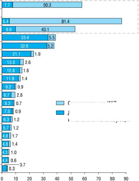 Рисунок 2 - Удельный вес работников, занятых в профессиях, связанных с интенсивным использованием информационно-коммуникационных технологий по видам деятельности, 2023 год (в процентах от общей численности занятых соответствующего вида деятельности) [4, с.70-75; 5, с. 132].