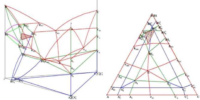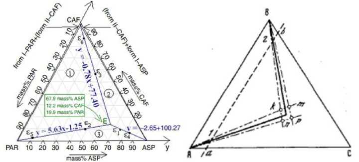 Рис. 7. T-x 1 -x 2 диаг ра м ма пр о т отипа ф ар м аце в тичес ко й с истем ы ПАР-КОФ-АСП (слева), x 1 -x 2 пр о екция д иаг р ам м ы (спр ав а ) . В б инар ной сис т ем е А -В проходит р е а к ци я к ат а т ектич е с кого т ипа, в сис т ем е В-С — перитектического типа