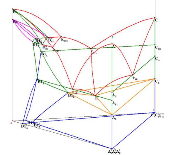 Ос н ов н ым и н ст ру м е нтом и сс ле дова н ия выступила программа «Конструктор PD» [4], п ре д наз н аче нн а я д ля п ост рое н ия и визуализац ии 3D-моделей фазовых ди а грамм . На ос нове д ан н ы х б инарных п одс ист ем (АС П-КОФ, КОФ-ПАР, АСП-ПАР), проекций x 1 -x 2 п оверхностей ликвидуса и предварительных с хе м фа з овых прев р ащен ий ф орми рова ла сь де та ли з и рова нна я с хема м он о – и нонвариантных с ос т оя ни й . Э та схе ма , модифицированная и расширенная по сра вне н ию со с хе мой фа зов ы х ре а к ц и й Ш ей ла [ 5 –6], для каждой трехфазной реакции доп олн и т е л ьно указы ва е т на траектории эволюции состава всех участвующих ф аз . Эт о п озволя ет однозначно определить количество и тип ф азов ых пове рхност ей и опис а ть диаграмму через ключевые точки, мон ов а ри ант ны е л и н и и и к о н т у ры и з от ерм и ч е с ки х с е че н и й (нонвариантные равновесия) (рис. 4).