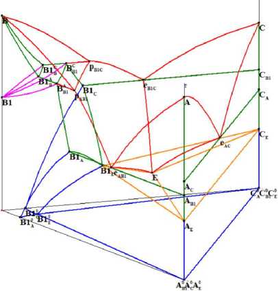 Т е хнолог и я п ост ро ения пространственных компьютерных моделей и зобарны х фазовых ди а грам м трой ны х с и с те м оп и са на ещ е в 2010 г. [7]. На рис. 5 изобра же н п р от от и п ф азовой диа г раммы трой н ой с ист ем ы П АР-КОФ-АСП, где компонент А — пара цетамол, к о мп он ен т В — кофеин, компонент С — аспирин. Как видно, н а д а н ном прот от и п е поли морфи зм к оф еина наблюдается у двух бинарных систем А-В и В-С с реакцией кататектического типа, что схе м а т и ч но и з ображено на схеме моно– и нонвариантных состояний (рис. 4).