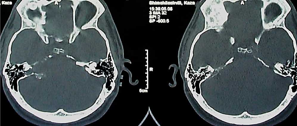 Рисунок 2. Аксиальный КТ-снимок основания черепа через внутренний слуховой проход справа