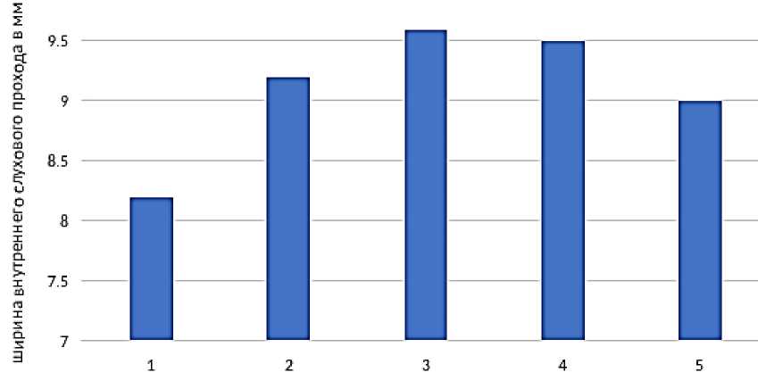 В 12 случаях яремная луковица располагалась выше, чем обычно. Ширина ВСП по данным КТ в костном режиме была 9,3±2,6 мм. Возрастающее расширение ВСП отмечалось при ВШ с Т1 до Т2 распространения опухоли, при этом не отмечено дальнейшего расширения ВСП до степени Т5 опухолей (Рисунок 3).