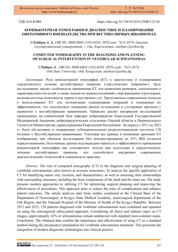 Роль компьютерной томографии (КТ) в диагностике и планировании хирургического лечения вестибулярных шванном («акустических неврином»). Цель исследования: анализ особенности применения КТ для выявления размеров, локализации и характеристики опухолей, а также оценки их взаимоотношений с окружающими структурами, включая костные компоненты черепа и внутреннее ухо. Представлены современные подходы к использованию КТ для оптимизации планирования операций и повышения их эффективности, что способствует снижению рисков осложнений и улучшению прогноза у пациентов с вестибулярными шванномами. Приведен анализ материалов исследований проведенных на клинической базе кафедры нейрохирургии Кыргызской Государственной Медицинской Академии, нейрохирургических отделениях Ошской области и Национального Госпиталя Министерства здравоохранения Кыргызской Республики. За период с 2013 по 2023 гг. было обследовано и оперировано субокципитальным ретросигмовидным доступом 120 больных с Вестибулярными шванномами. Учитывая все прямые и косвенные признаки КТ изображения, при обычном исследовании (без контрастирования) до 41% ВШ остаются нераспознанными. Полученные данные подтверждают важность и эффективность применения компьютерной томографии как стандартного метода при подготовке к хирургическому лечению вестибулярных шванном, что способствует внедрению современных диагностических технологий в клиническую практику.