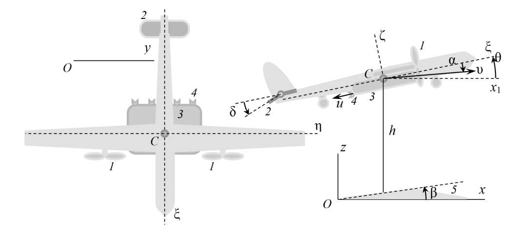 Примечание: Oxyz – неподвижная ортогональная система декартовых координат с началом O на уровне моря, горизонтальными осями Ox , Oy и вертикальной осью Oz , направленной вверх; C ξηζ – связанная с малым беспилотным летательным аппаратом ортогональная система декартовых координат с началом C в центре масс малого беспилотного летательного аппарата, осью C ξ, совпадающей с главной продольной осью инерции малого беспилотного летательного аппарата, перпендикулярной ей осью C ζ в плоскости симметрии малого беспилотного летательного апарата и перпендикулярной обеим этим осям осью C η; Cx 1 – подвижная горизонтальная ось, параллельная оси Ox ; x , z – координаты центра масс малого беспилотного летательного аппарата (точки C ) в неподвижной системе координат по осям Ox , Oz , м; β – угол наклона средней прямой линии профиля поля в продольной вертикальной плоскости, рад; υ ‒ величина скорости центра масс малого беспилотного летательного аппарата, м/с; α – угол атаки, образуемый продольной осью C ξ и вектором υ или проекцией вектора υ на плоскость симметрии малого беспилотного летательного аппарата, рад; h – высота полета над полем, м; δ – угол поворота руля высоты с отсчетом от нулевого положения, рад; u ‒ величина скорости частиц вещества, распыляемого при обработке поля, относительно корпуса малого беспилотного летательного аппарата в направлении, противоположном направлению продольной оси C ξ ( u > 0), м/с;