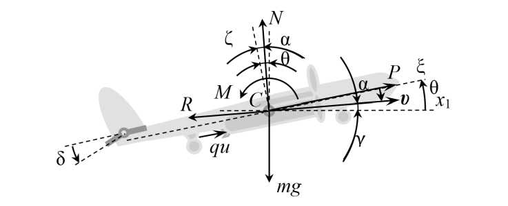Примечание: θ – угол тангажа, образуемый осями C ξ и Cx 1, рад; γ – траекторный угол, образуемый вектором скорости υ и осью Cx 1 (γ = θ - α), рад; m – масса малого беспилотного летательного аппарата, кг; q ‒ расход рабочего вещества при обработке поля на единицу длины пути вдоль оси Ox , кг/м; P ‒ величина главного вектора сил тяги двух пропеллеров (сила тяги), Н; N ‒ величина главного вектора подъемных сил (подъемная сила), Н; R ‒ величина главного вектора сил сопротивления (сила сопротивления), Н; M ‒ величина главного момента внешних силы относительно оси C η, Н м; g ‒ ускорение свободного падения материальной точки, м/с2.
