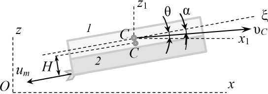 Примечание: υ С – вектор скорости центра масс малого беспилотного летательного аппарата; um – вектор скорости частицы рабочего вещества на выходе из форсунок относительно корпуса малого беспилотного летательного аппарата; H – расстояние от центра масс до линии вектора um , приложенного к форсунке в плоскости симметрии малого беспилотного летательного аппарата, м.