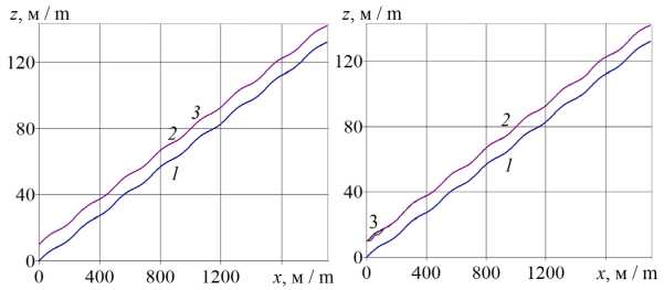 Р и с. 5. Зависимости от координаты x координаты z (высоты над уровнем моря) точек линии волнистого профиля поля 1 и центра масс малого беспилотного летательного аппарата при программном (а) и траекторном (b) управлении при полете с заданной скоростью: