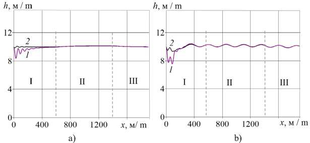 Р и с. 6. Зависимости высоты полета h над полем с прямолинейным наклонным профилем (а) и волнистым наклонным профилем (b) от координаты x при траекторном управлении и заданной скорости: