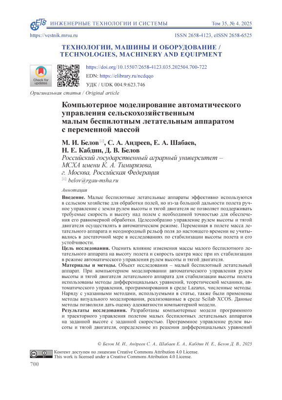Текст научной статьи Компьютерное моделирование автоматического управления сельскохозяйственным малым беспилотным летательным аппаратом с переменной массой